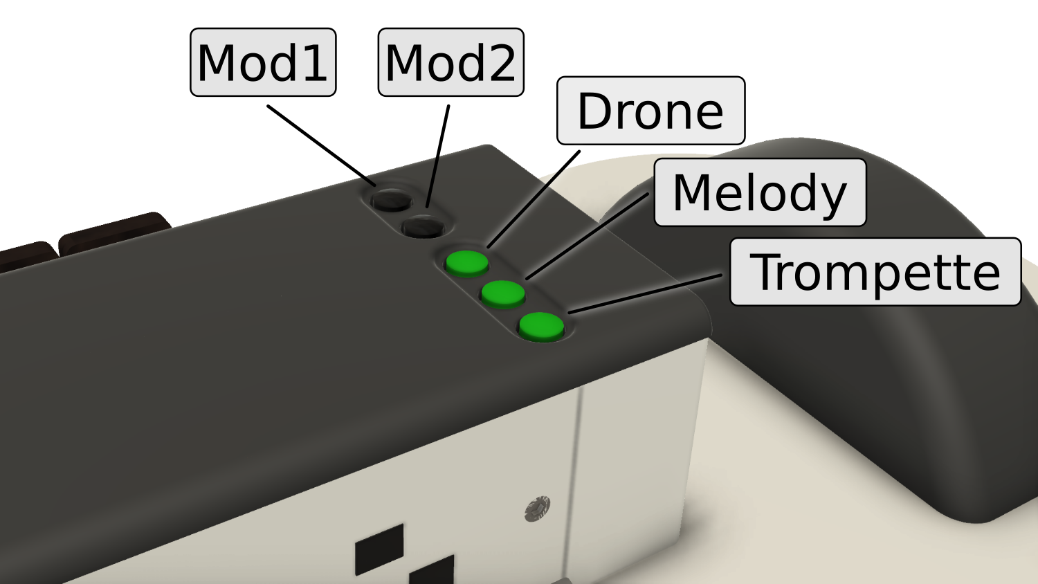 The action of the Modifier Buttons can also be changed in the Web-Interface. For example, once you are more familiar with the MidiGurdy and you want to use more than three strings, you can use there buttons to select a second or third set of strings.