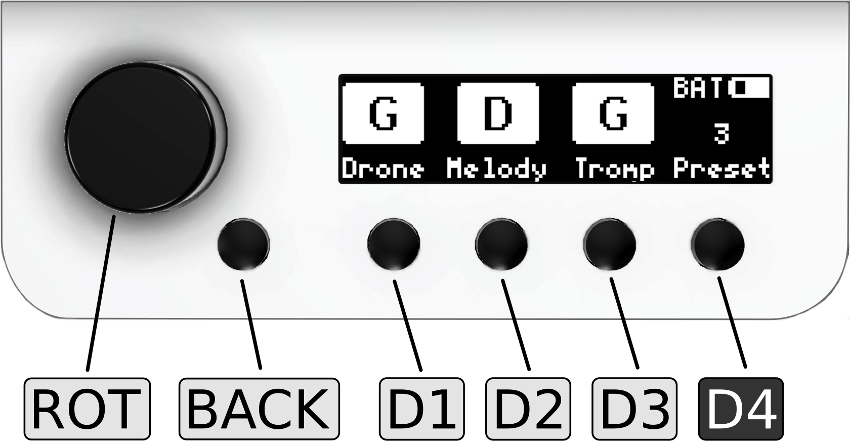 The main user interface of the MidiGurdy consists of the display, a rotary knob and five buttons. First a short overview explaining the most important functions of the interface. For a detailed description of the settings and the menu system, please see the section The Menu System.