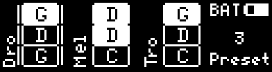 The home screen uses a different layout in two strings mode. It shows two rows of strings, each row represents one string set. Which string set is active is shown by the vertical lines next to the string indicators.